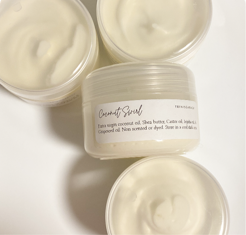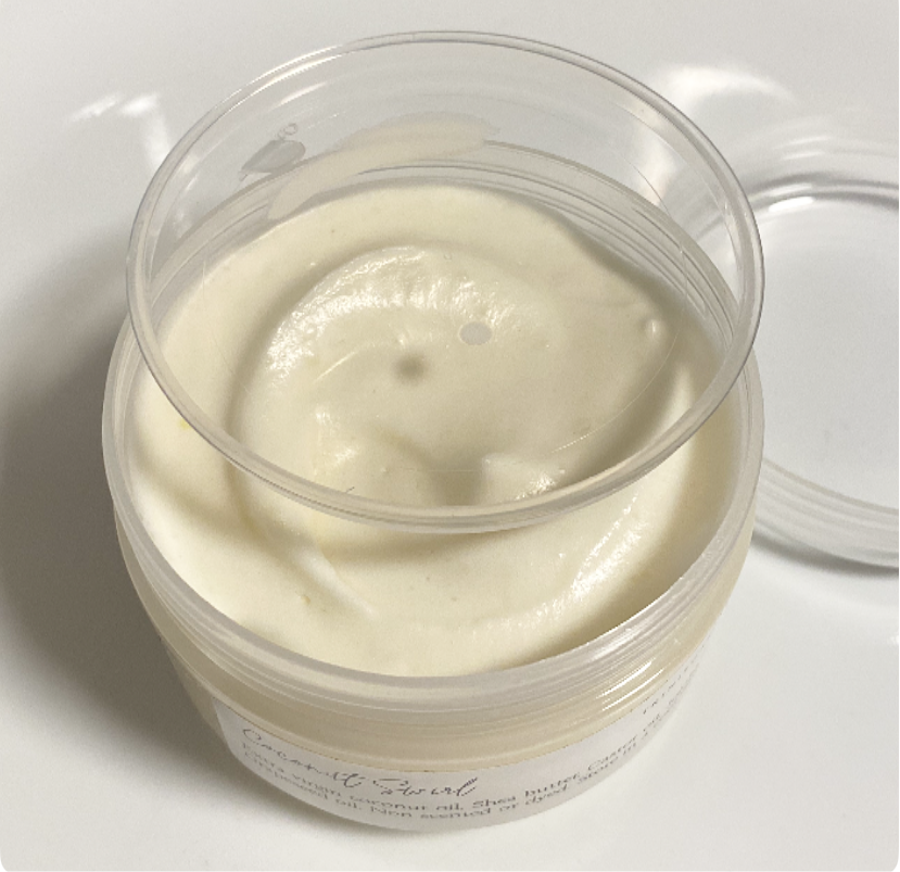 Made with: Organic Extra virgin coconut oil, raw ivory Shea butter, Jojoba oil, and Castor oil. No dyes or Fragrance. Contains a wonderful natural scent 🥥